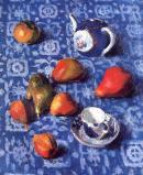 Синяя скатерть с ритмически повторяющимися звеньями узора изображена совершенно плоскостно, как некий условный декоративный фон. Красные и зелено-желтые груши, синий чайник, белая с синим рисунком чашка разбросаны по нему в определенном цветовом ритме, сохраняющем ощущение плоскости холста. Цвет, декоративное начало выступают тут как главные моменты, определяющие построение композиции, создание художественного образа. В сущности, именно в творчестве Грабаря мы имеем дело с одним из первых образчиков аналитического, „проблемного” натюрморта; характерно, что декоративность композиции отнюдь не идет в ущерб реалистической убедительности изображения в целом.