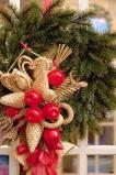 Попробуйте вплести в новогодний венок сухофрукты, сухоцветы, обернутые в яркую бумагу орехи или просто маленькие картонные коробочки, обвязанные лентами. Постарайтесь определиться с цветом и следовать этой цветовой гамме при новогоднем оформлении всего Вашего дома: использование более трех цветов не рекомендуется, так как это создаст ощущение беспорядка и небрежности в оформлении, нарушит общую идею и ощущение комфорта.
